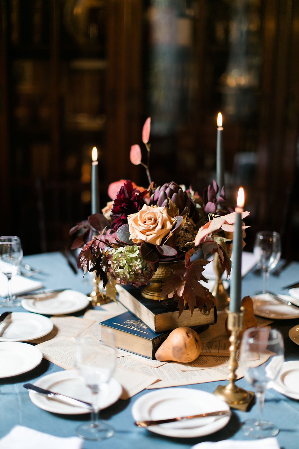 Finally, for our florals and overall color scheme of gold and slate blue, we embraced the Fall season. I wanted to use as much golden yellow foliage as I could and added touches of deep red. Each centerpiece was slightly different from the next with varying autumn shades and flowers and each was accompanied by pears which were hand painted gold by my sister in law.